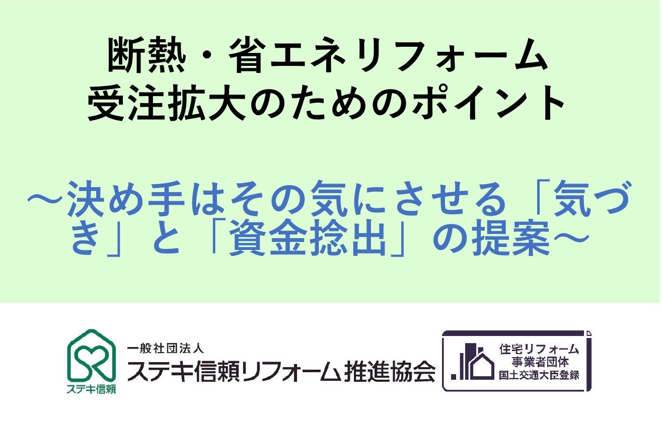 ニュース ダウンロード よくある質問 動画 会員特典・レンタル会員特典レンタル ALL(新着順) お施主様用 セミナー 耐震・防災 断熱・省エネ ペット 内装・インテリア ツール 『断熱・省エネリフォーム受注拡大のためのポイント』~決め手はその気にさせる「気付き」と「資金捻出」の提案! [講師]ステキ信頼リフォーム推進協会 セミナー動画資料 « PREV MOVIE NEXT MOVIE » お役たち動画一覧