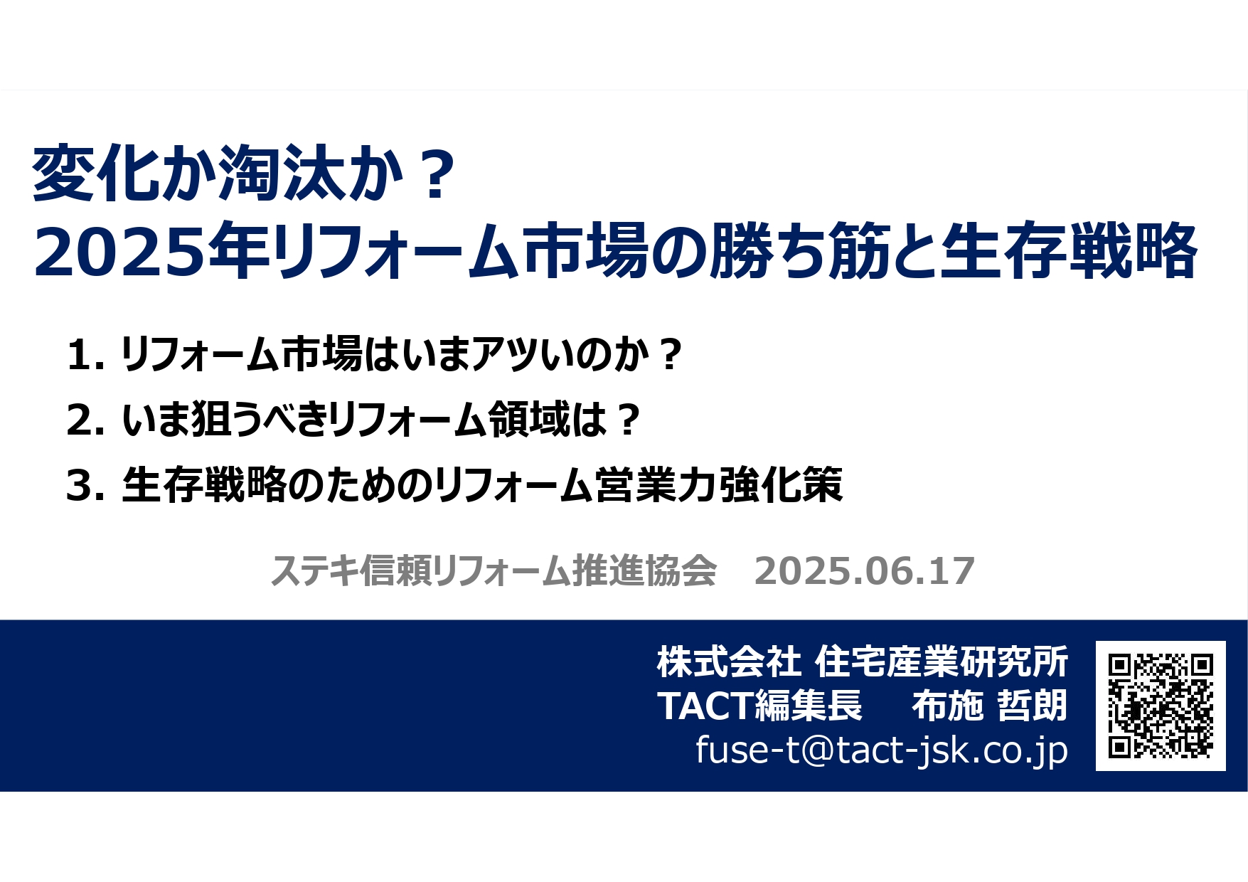 ニュース ダウンロード よくある質問 動画 会員特典・レンタル会員特典レンタル ALL(新着順) お施主様用 セミナー 耐震・防災 断熱・省エネ ペット 内装・インテリア ツール ステキ信頼セミナー『変化か淘汰か?2025年リフォーム市場の勝ち筋と生存戦略』 講師 株式会社 住宅産業研究所/ACT編集長 布施 哲朗氏 « PREV MOVIE NEXT MOVIE » お役たち動画一覧